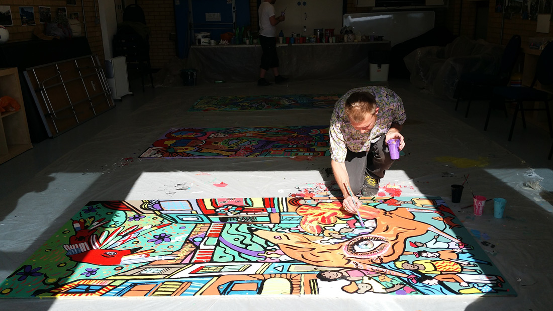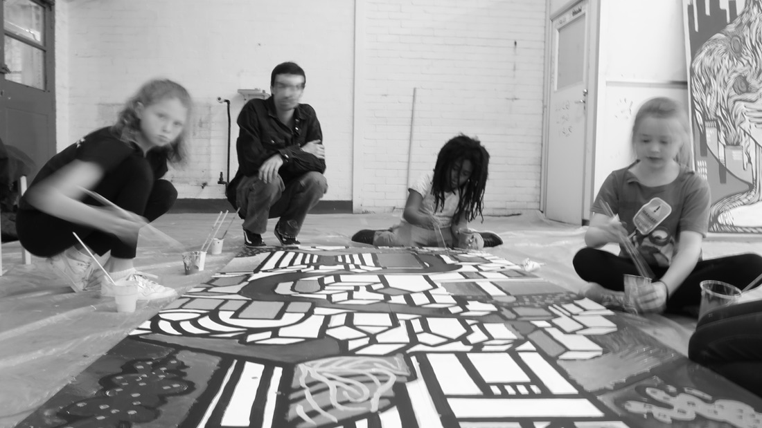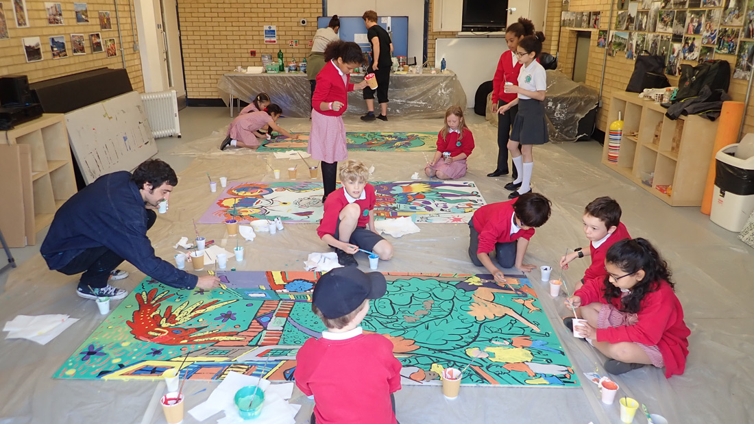 The Bigger Picture was an initial collaboration of Progress, Mark Peters, students from H House, and Larkhall School, Vesna Parchet, Krum Baglesky, Ruben Pires, and Barry Reigate. Our idea was to work with a group of children from both local schools and get them to represent the journey between Stockwell and Balham tube station, with London based underground public artists. The success of the project in motion and subsequent exhibition, led us to replicate the idea with FerArts and local school children from the Ladbroke Grove. This artwork has been since used to decorate community work “pod” on Acklam Road, leading up to Portobello Market. This has been a very successful process with high impact results, for the young people involved.